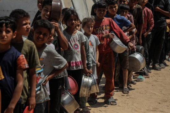 5月28日,孩子们在加沙城西部的沙提难民营等待领取救助食物。新华社发(里泽克·阿卜杜勒贾瓦德摄)