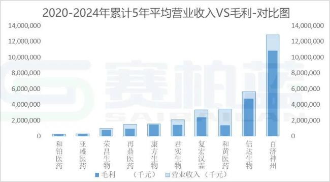 从2020-2024年累计5年平均营收来看,百济神州、信达生物、和黄医药为前三,和铂医药排名末尾。从2020-2024年累计平均5年毛利来看,百济神州、信达生物、复宏汉霖前三,和铂医药排名末尾。百济神州和信达生物无疑已经成为中国头部创新药企业。