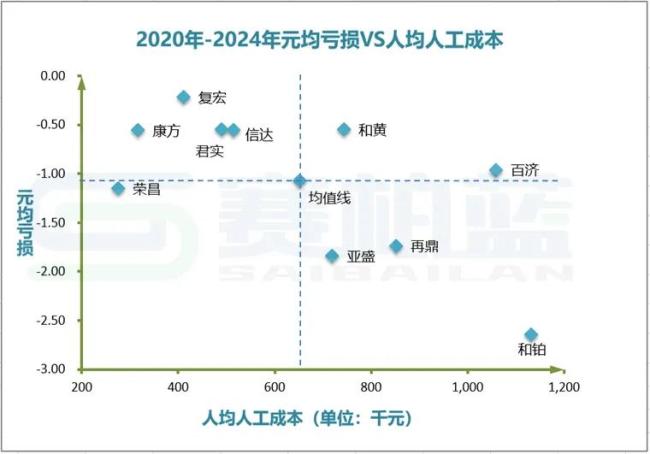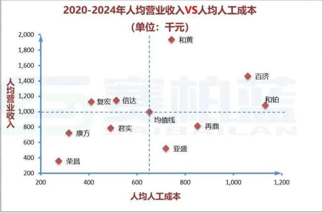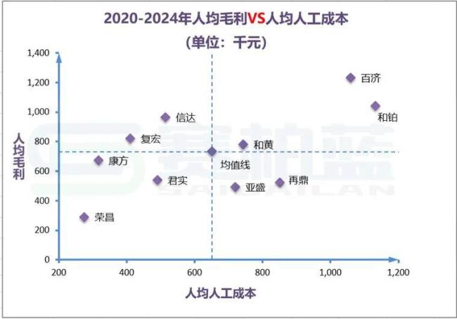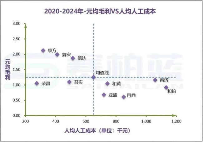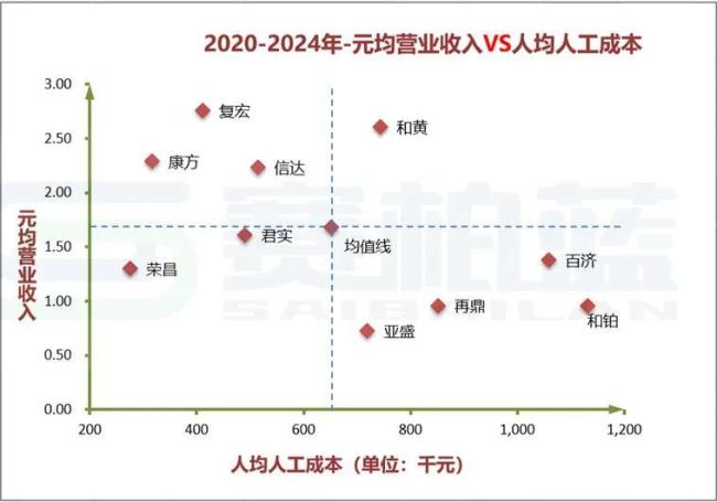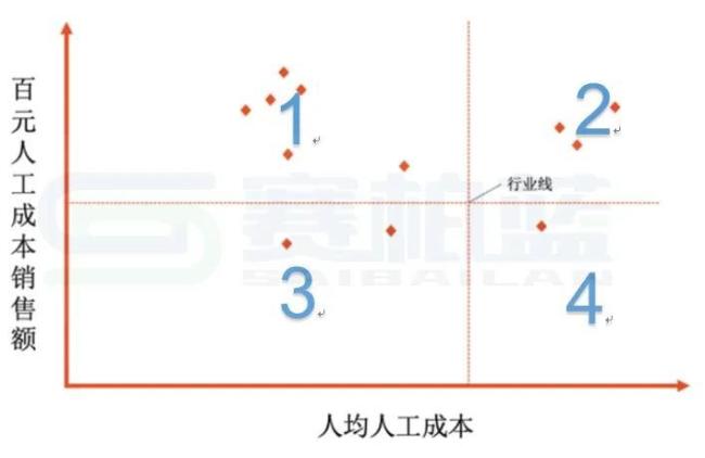 横轴代表人均人工成本(成本),纵轴代表人效指标(投入),每一个散点代表一家企业,中间虚线部分代表行业中位值。