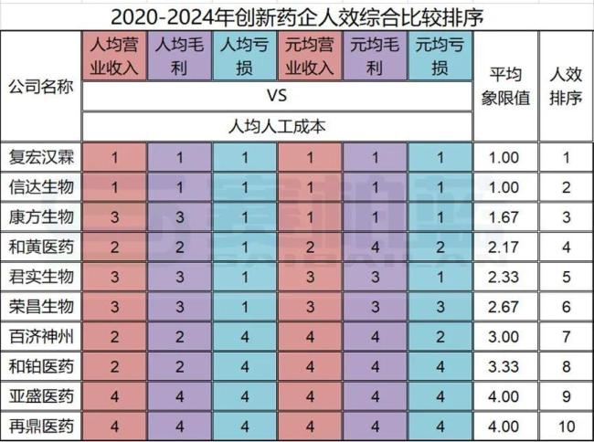 笔者选取2020年至2024年十家创新药企的累计5年综合平均人效指标数据: