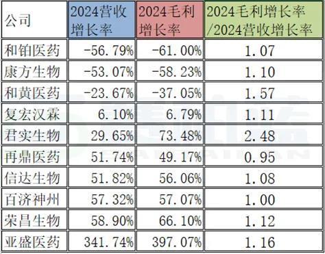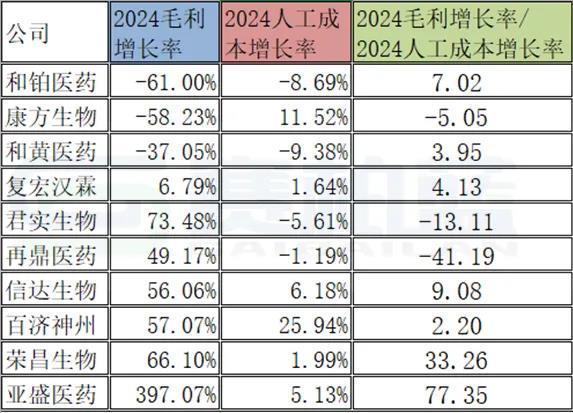 从此图表中可以看出,君实生物的2024毛利率增长率/营收增长率的比值为2.48为最高,主要因为公司营业成本同比下降24.08%,其核心产品组合的单位生产成本降低。通过优化生产工艺和加强费用管控,单位成本显著下降,直接提升了毛利率。