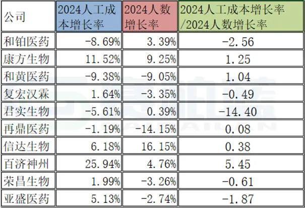 从此图表中可以看出,君实生物2024人工成本增长率/人数增长率比值是-14.4,2024人工成本增长率是-5.61%,人数增长率是0.39%,也就是说人数增长了一点点,但人工成本下降幅度大。