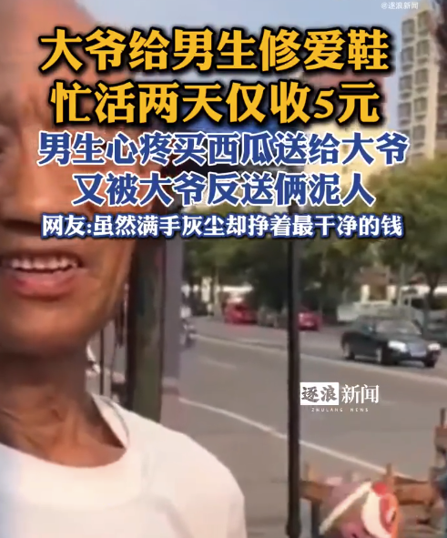 山东,大爷给男生修爱鞋,忙活两天仅收5元,男生心疼买西瓜送给大爷解暑,男生:老爷爷很开心,硬要送俩泥人给我还不让付钱。