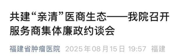 事实上,此类约谈并非个例。赛柏蓝观察发现,近段时间来,已经有不少大三甲召开服务商集体廉政约谈会。如8月15日,福建省肿瘤医院发布消息,院纪委组织召开第二批重点岗位项目服务商集体廉政约谈会,医院相关负责人以及10家服务商代表参加了会议。