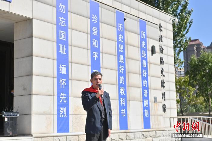 9月18日,吉林长春,马继志在东北沦陷史陈列馆前讲述爷爷杨靖宇的故事。张瑶 摄