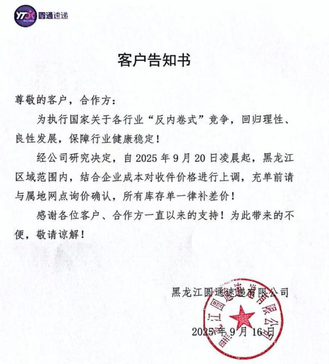 快递费上调仍在继续。除了此前的浙江和广东两地,近期湖北、天津、山东以及辽宁等地也陆续宣布上调快递费。以黑龙江为例,9月15日和16日,圆通在内的多个主流快递品牌发布公告称,自9月20日凌晨起将结合企业成本对收件价格进行上调,同时库存单需要补差价。