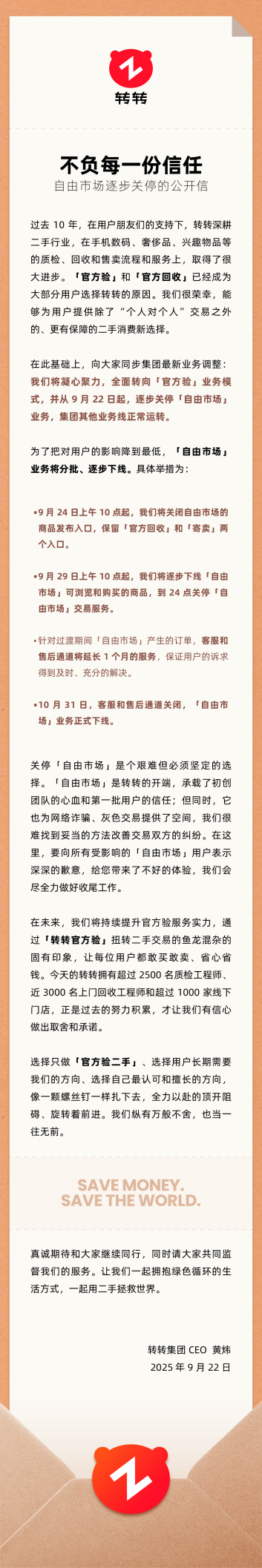 9月22日,转转集团发布官方公告(以下简称公告),宣布将逐渐关停旗下“自由市场”业务。公告称,未来,转转将全力聚焦二手“官方验”业务模式,为用户提供除了“个人对个人”交易之外的、更有保障的二手消费新选择。并强调集团其他业务线正常运转。