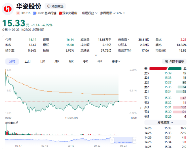 装修建材板块午盘走弱 华瓷股份股价下跌7.41%