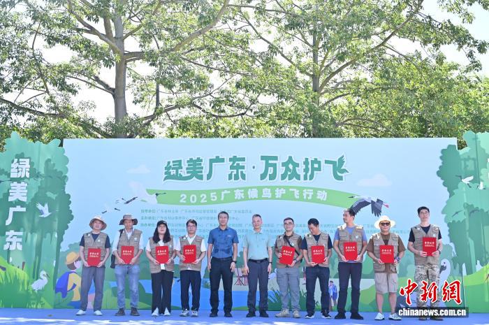 9月27日,2025年广东候鸟护飞行动启动仪式在位于广东省广州市的南沙湿地景区举行。本次活动以“绿美广东·万众护飞”为主题,近10家鸟类保护相关单位现场布展,通过打卡互动、公益课程体验、趣味鸟类科普小游戏等为民众科普野生鸟类保护法律法规和科学知识。图为爱鸟护鸟团体和志愿者荣誉证书颁发环节。中新社记者 陈楚红 摄