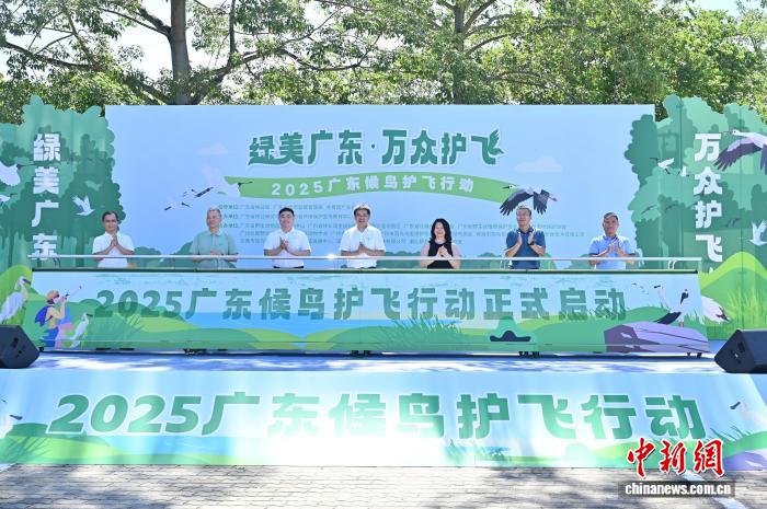 9月27日,2025年广东候鸟护飞行动启动仪式在位于广东省广州市的南沙湿地景区举行。本次活动以“绿美广东·万众护飞”为主题,近10家鸟类保护相关单位现场布展,通过打卡互动、公益课程体验、趣味鸟类科普小游戏等为民众科普野生鸟类保护法律法规和科学知识。图为启动仪式。中新社记者 陈楚红 摄