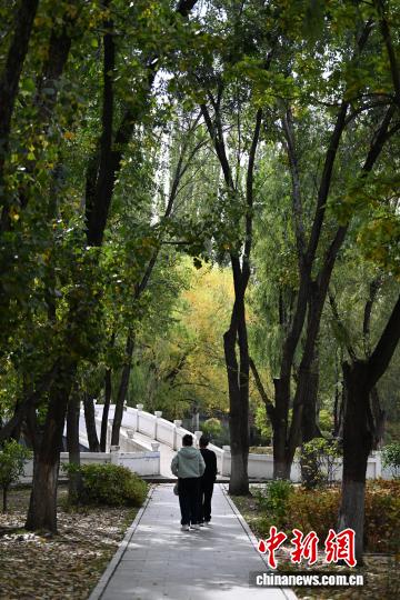 10月11日,内蒙古呼和浩特市,民众在公园小道漫步。中新社记者 刘文华摄