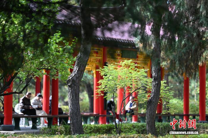 10月11日,内蒙古呼和浩特市,民众坐在凉亭内放松交流。中新社记者 刘文华摄