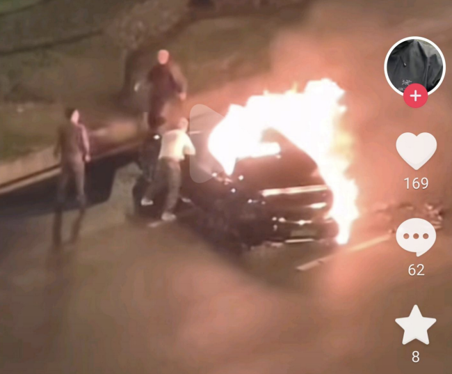 现场:成都天府大道小米自燃,多人尝试用拳砸、脚踹等方式破窗