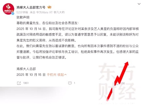 10月15日,@鸡柳大人总部官方号发布致歉声明,“尊敬的黄星先生、各位粉丝及社会各界朋友: