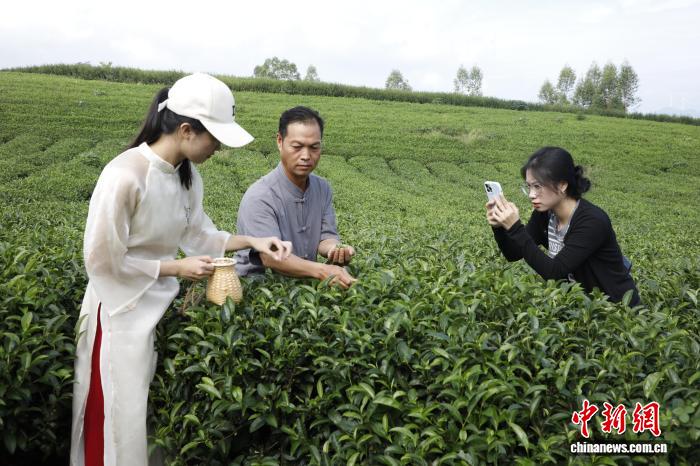 10月14日,越南留学生在广西来宾市象州妙皇乡茶园学习采茶和拍摄技术。黄黎欣 摄
