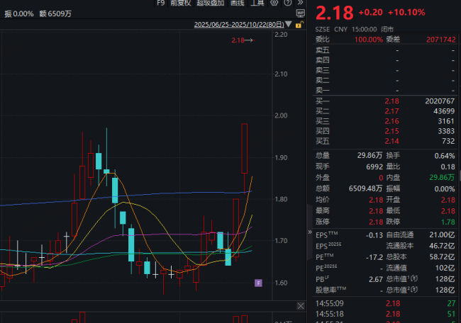 10月22日,盈新发展开盘继续涨停,斩获三连板,报2.18元/股,总市值128亿元。