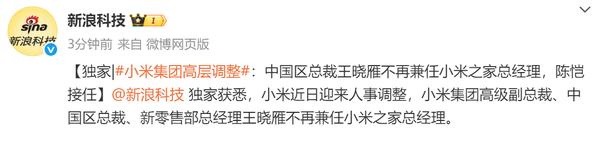 据新浪科技消息,小米集团近期进行了新一轮人事调整,原由集团高级副总裁、中国区总裁、新零售部总经理王晓雁兼任的小米之家总经理一职,现已由陈恺接任。陈恺此前担任小米云南分公司总经理,此次调整后,他将同时担任新零售部小米之家总经理,并继续兼任云南分公司总经理,向王晓雁汇报。