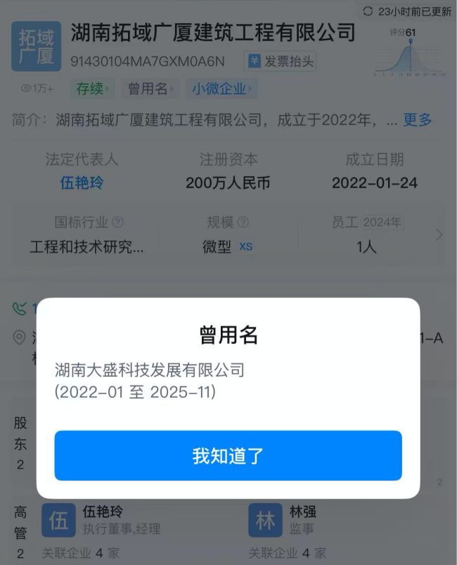但中华网财经注意到,其国内商标注册主体实为"湖南大盛科技发展有限公司",自2022年3月开始申请注册本桑制药相关商标,不过截至发稿,该公司已于近日更名“湖南拓域广厦建筑工程有限公司”。