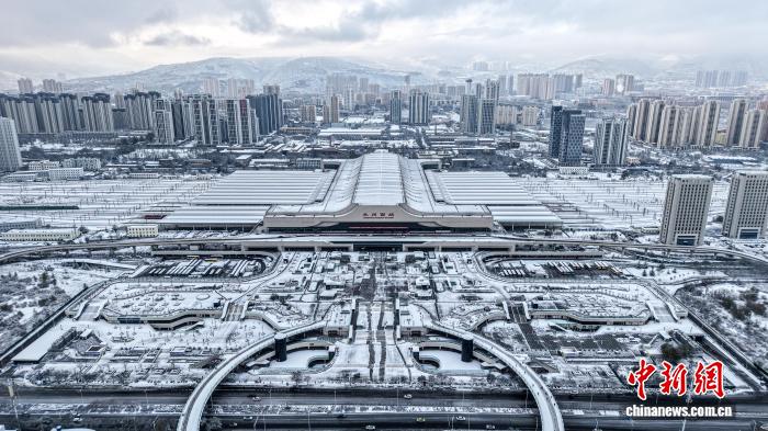 11月24日,甘肃兰州迎来今冬首场降雪。图为雪后的兰州西站。(无人机照片)中新社发 张博行 摄