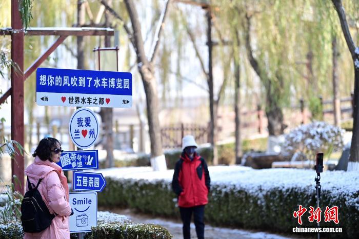 11月24日,甘肃兰州迎来今冬首场降雪。图为市民雪后在兰州水车博览园打卡拍照。中新社记者 九美旦增 摄