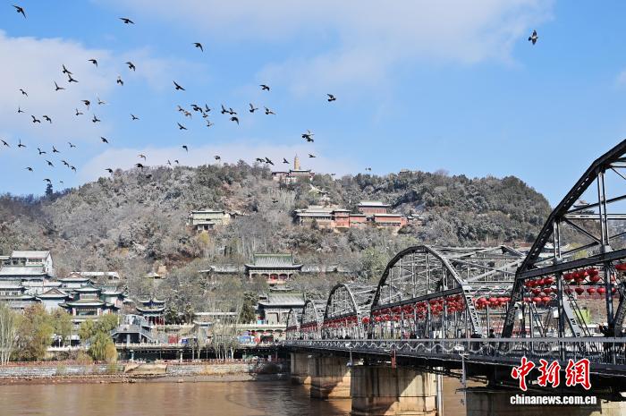 11月24日,甘肃兰州迎来今冬首场降雪。图为雪后的兰州中山桥和白塔山公园。中新社记者 九美旦增 摄