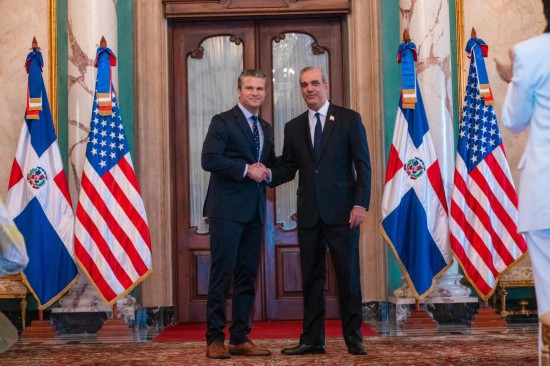 2025年11月26日,在多米尼加圣多明各,多米尼加总统阿比纳德尔(右)与来访的美国国防部长赫格塞思在多总统府会晤。新华社发(多米尼加总统府供图)
