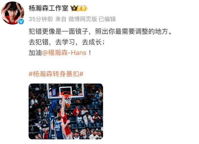 杨瀚森工作室随后发文表示,犯错像一面镜子,能够反映出需要调整的地方。鼓励杨瀚森去犯错、去学习、去成长,并为他加油。