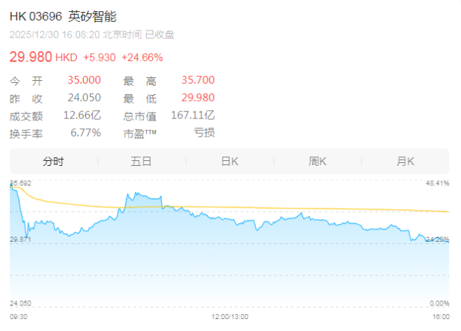 香港交易所的钟声在交易大厅回荡,伴随着屏幕上一路跳升的数字——英矽智能的股价从发行价24.05港元飙升至35港元,涨幅定格在45.53%。截至今日收盘,英矽智能股价上涨24.66%,报29.98港元/股,市值近168亿港元。这不是普通的新股上市,而是一场关于未来制药的革命宣言。