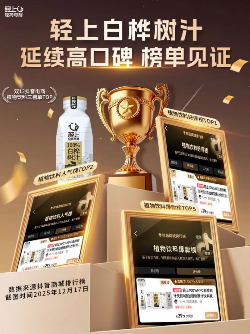 双12电商大促收官之战落下帷幕,轻上白桦树汁稳稳占据抖音植物饮料好评榜前列位置。自2024年10月上市以来,这款森林系健康饮品便开启了“霸榜”征程,长期盘踞各大电商核心榜单,跻身轻上亿级大单品阵营,奠定了自身“森林健康饮品赛道标杆”的行业地位。轻上究竟凭借什么实现持续领跑?其背后的竞争力构建与品牌发展思路,值得行业深入探究。