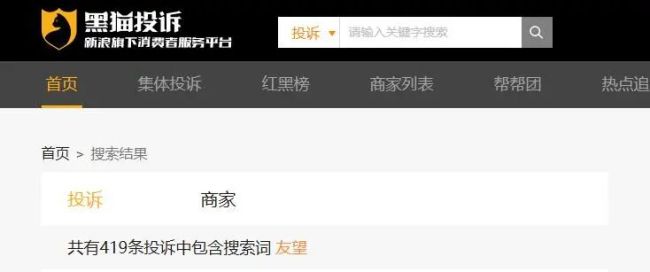 在黑猫投诉以“友望”为关键词搜索,得到419条结果,投诉内容大多指向产品质量不过关,售后服务不负责等问题;在全国12315消费投诉信息公示平台上,也有消费者表示购买的友望产品存在质量问题。