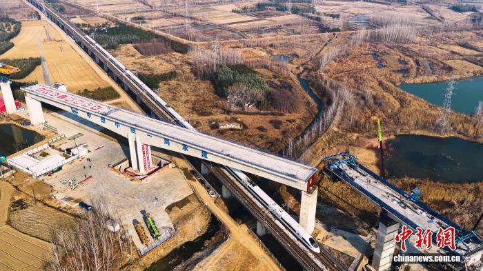 1月16日,沪宁合高铁跨京沪高铁特大桥2×100米预应力混凝土单T构梁成功转体。(无人机照片)(中国中铁一局集团有限公司供图)