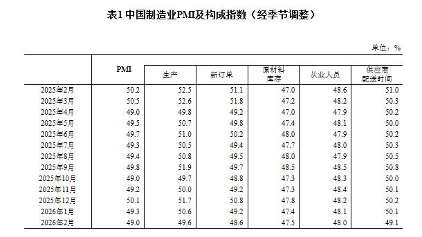 国家统计局:2月份制造业采购经理指数为49.0%