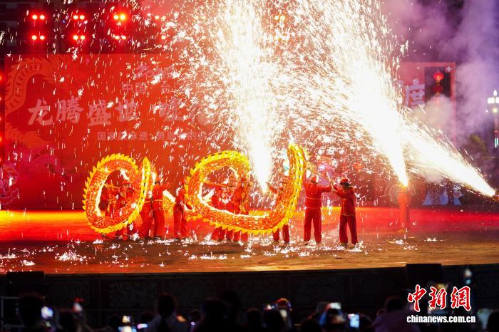 中新社贵州台江3月4日电 (记者 周燕玲)3日,中国农历元宵节当晚,贵州台江县城人潮涌动,数十条龙灯在夜色中翻腾起舞,民众手持嘘花筒对准舞动的龙身喷射,刹那间,火光与龙影交织,绽放成璀璨的“火树银花”。