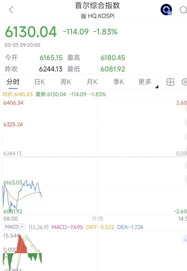 3月3日,日韩股市开盘大跌。截至发稿,日经225跌1.06%,韩国首尔综指跌幅扩大至1.83%,报6130.04点。韩元兑美元跌1.5%。韩国金融市场昨日因假期休市。