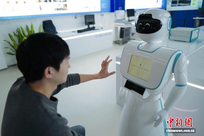 图为医疗服务机器人与参观者进行阿尔茨海默症检测互动。中新社记者 张煜欢 摄