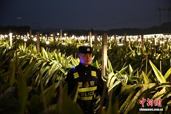 莫鸿铭在夜幕下的火龙果地中开展巡逻工作。曹顺骞 摄