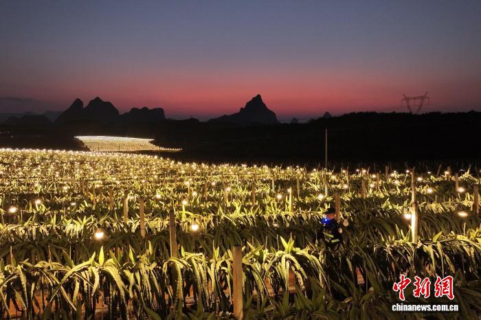 夕阳下,莫鸿铭在火龙果地开始一天的夜间巡逻工作。古庭玮 摄