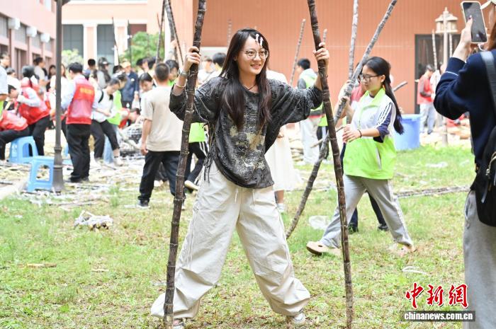3月19日,学生在位于广州市天河区的华南农业大学领取免费的南沙黑皮果蔗。据了解,本次该校发放的爱心甘蔗共100吨,以助农惠农为初心,由南沙农业农村局捐赠。中新社记者 陈楚红 摄