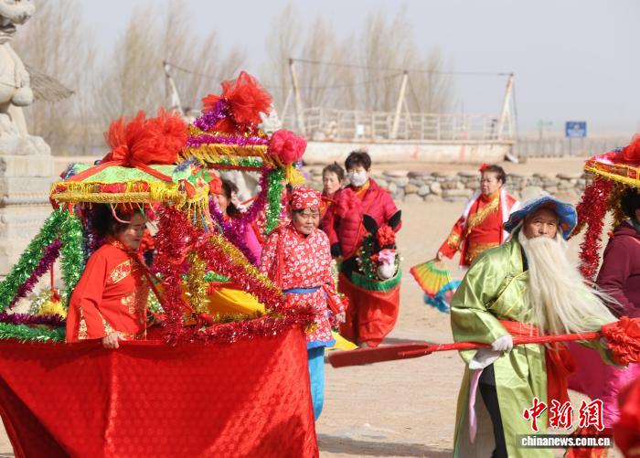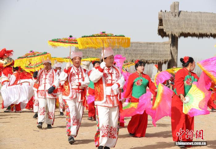 3月20日,正值农历二月初二“龙抬头”,位于宁夏银川市兴庆区月牙湖村的黄沙古渡景区内一场充满乡土气息的民俗表演热闹上演。当地村民以原汁原味的乡土表演,再现传统节日的文化魅力,表达对新一年风调雨顺、五谷丰登的美好祈愿。图为民俗表演现场。中新社记者 于晶 摄