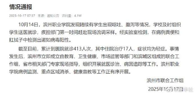 10月14日,滨州职业学院有学生陆续出现呕吐、腹泻等症状。学校迅速组织学生就医,并且疾控部门也第一时间到达现场进行调查和采样。实验室检测结果显示,在病例的粪便和肛拭子样本中发现了诺如病毒阳性