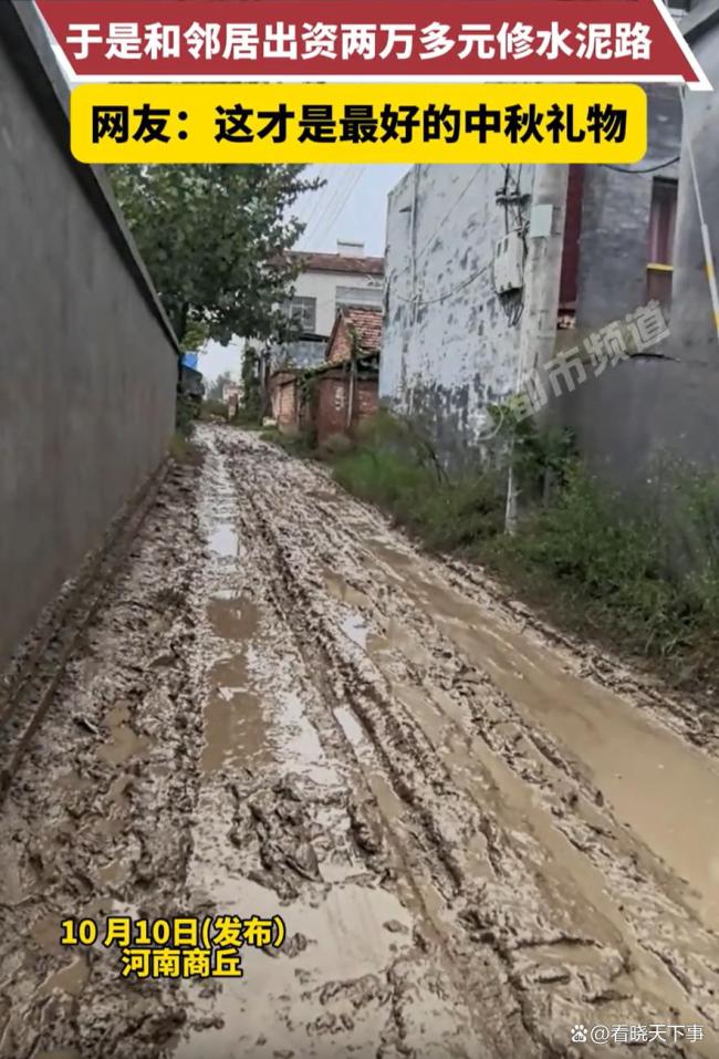 男子和邻居们自费2万元铺水泥路 善举温暖全村中秋假期,一名在外工作的男子回到河南老家,发现连日的雨水让村里的土路变得泥泞不堪。看到老人们艰难地在泥泞中行走,他心里很不是滋味,决定做点什么。他和邻居商量后,两家人凑了两万多元,请来工人拉水泥、拌料,开始修路