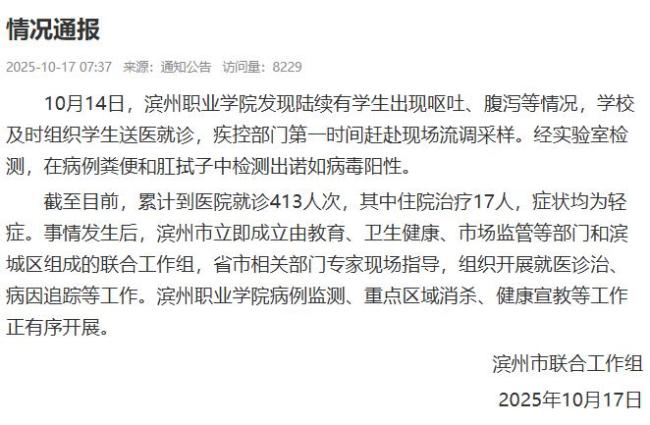 官方通报滨州多名学生呕吐腹泻 诺如病毒阳性确诊10-17