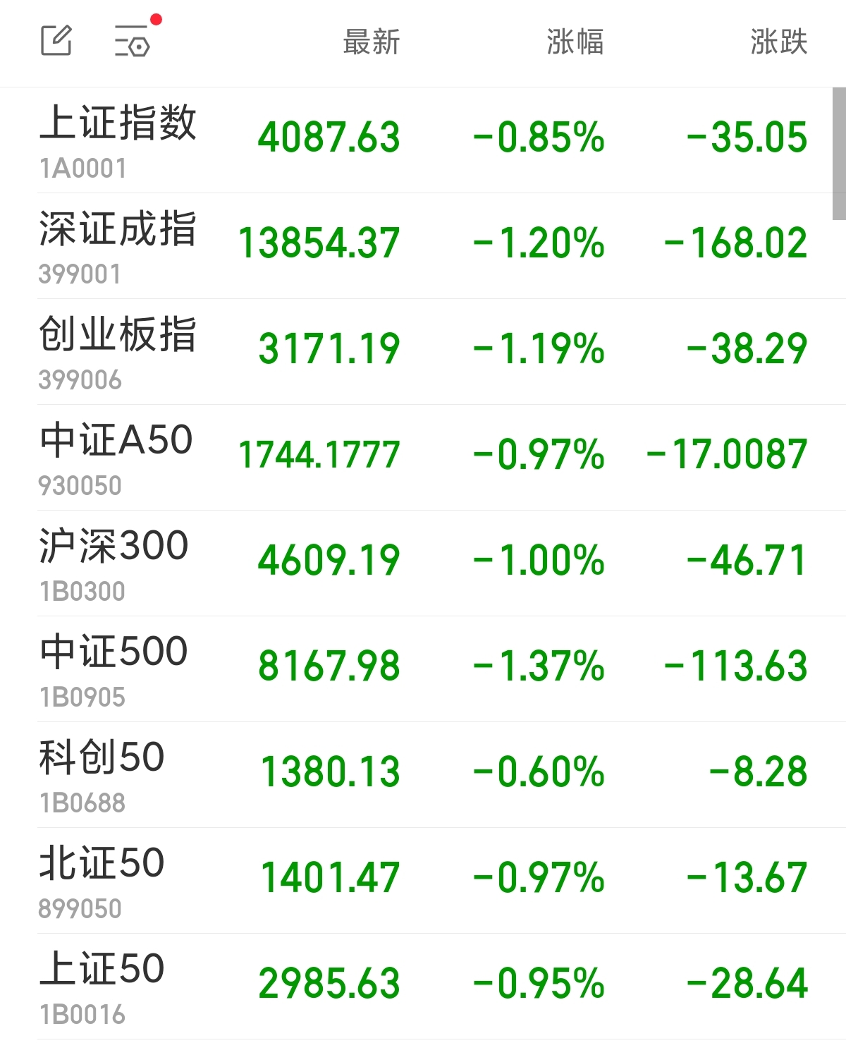 A股低开:贵金属板块回调,“三桶油”一度触及跌停中新经纬3月4日电 周三,A股三大指数集体低开。上证指数跌0.85%,报4087.63点;深证成指跌1.20%,报13854.37点;创业板指跌1.19%,报3171.19点。