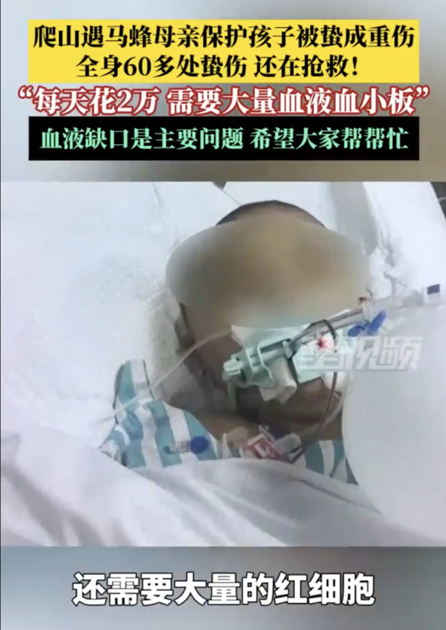 妈妈为保护儿子被马蜂蛰60多针!妈妈为保护儿子被马蜂蛰60多针。近日,重庆,彭先生一家去爬山遇马蜂,妻子谭小丽为保护9岁儿子被蛰成重伤陷入昏迷,还在重症监护室抢救。因为病情危重,随时有生命危险,谭小丽需要大量血浆置换治疗,用血需求大。彭先生向广大市民求助,有爱心人士愿意献...