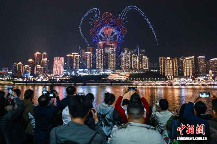 图为民众观看无人机灯光秀表演。中新社记者 何蓬磊 摄 图为民众观看无人机灯光秀表演。中新社记者 何蓬磊 摄