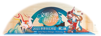 加强人文交流 传承文明瑰宝2025“世界市长对话·敦煌”会场布景。 本报记者宋朝军摄 中外嘉宾参加“世界市长对话·敦煌”开幕式。 新华社记者范培珅摄 外国嘉宾参观了解莫高窟风沙环境综合治理项目。 新华社记者范培珅