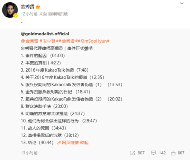 金秀贤转发律师视频声明 否认未成年交往传闻10月28日,金秀贤的官方微博账号转发了所属经纪公司goldmedalist对金秀贤与已故女星金赛纶纠纷事件的正式声明。这是金秀贤自2020年8月在微博分享生活动态后的最新更新