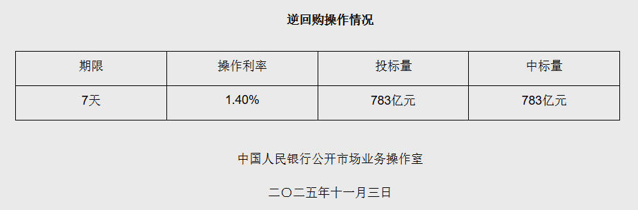 11月3日央行开展783亿元7天期逆回购操作中新网11月3日电 据央行网站消息,2025年11月3日中国人民银行以固定利率、数量招标方式开展了783亿元7天期逆回购操作。具体情况如下: