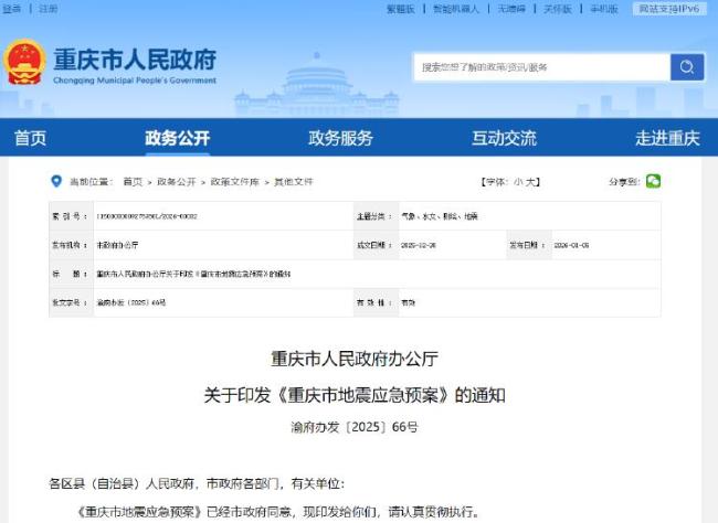 重庆发布地震应急预案 强化应急响应机制1月5日,重庆市人民政府办公厅发布《重庆市地震应急预案》,旨在健全地震应急机制,依法科学统一、有力有序有效应对地震灾害,最大程度减少人员伤亡和财产损失,维护社会正常秩序