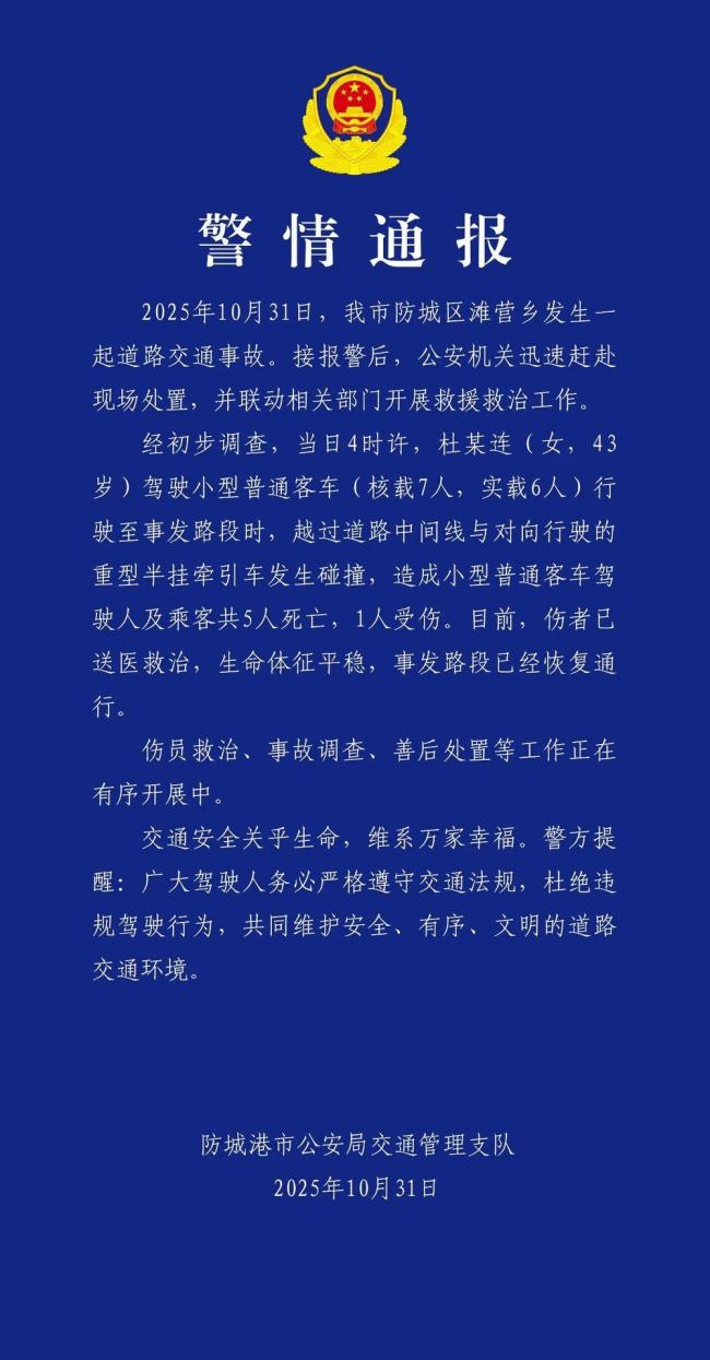 小客车与半挂车碰撞致5人死亡 事故现场已恢复通行10月31日中午,防城港交警通报了一起道路交通事故。事故发生在防城区滩营乡。当日4时许,杜某连(女,43岁)驾驶一辆小型普通客车(核载7人,实载6人)行驶至事发路段时,越过道路中间线与对向行驶的重型半挂牵引车发生碰撞